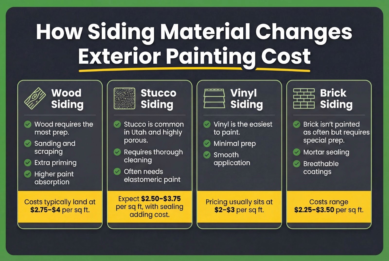 Exterior painting prices in Salt Lake City vary for clear, specific reasons – home height, surface condition, prep work, paint quality, and access all shape the final number.