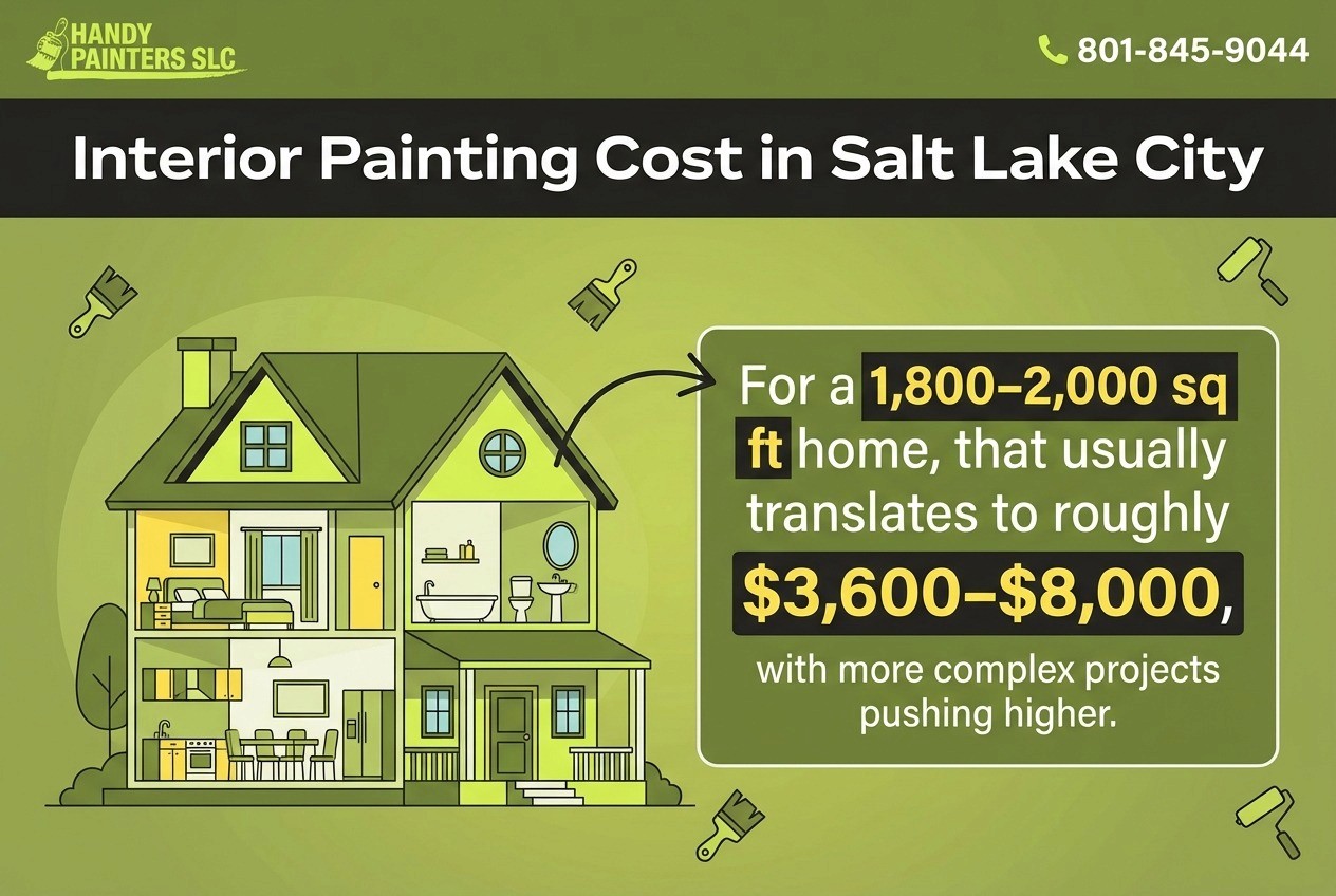 Most interior painters in Salt Lake City charge in the range of $2–$6 per square foot, depending on prep, surfaces, and finish level.